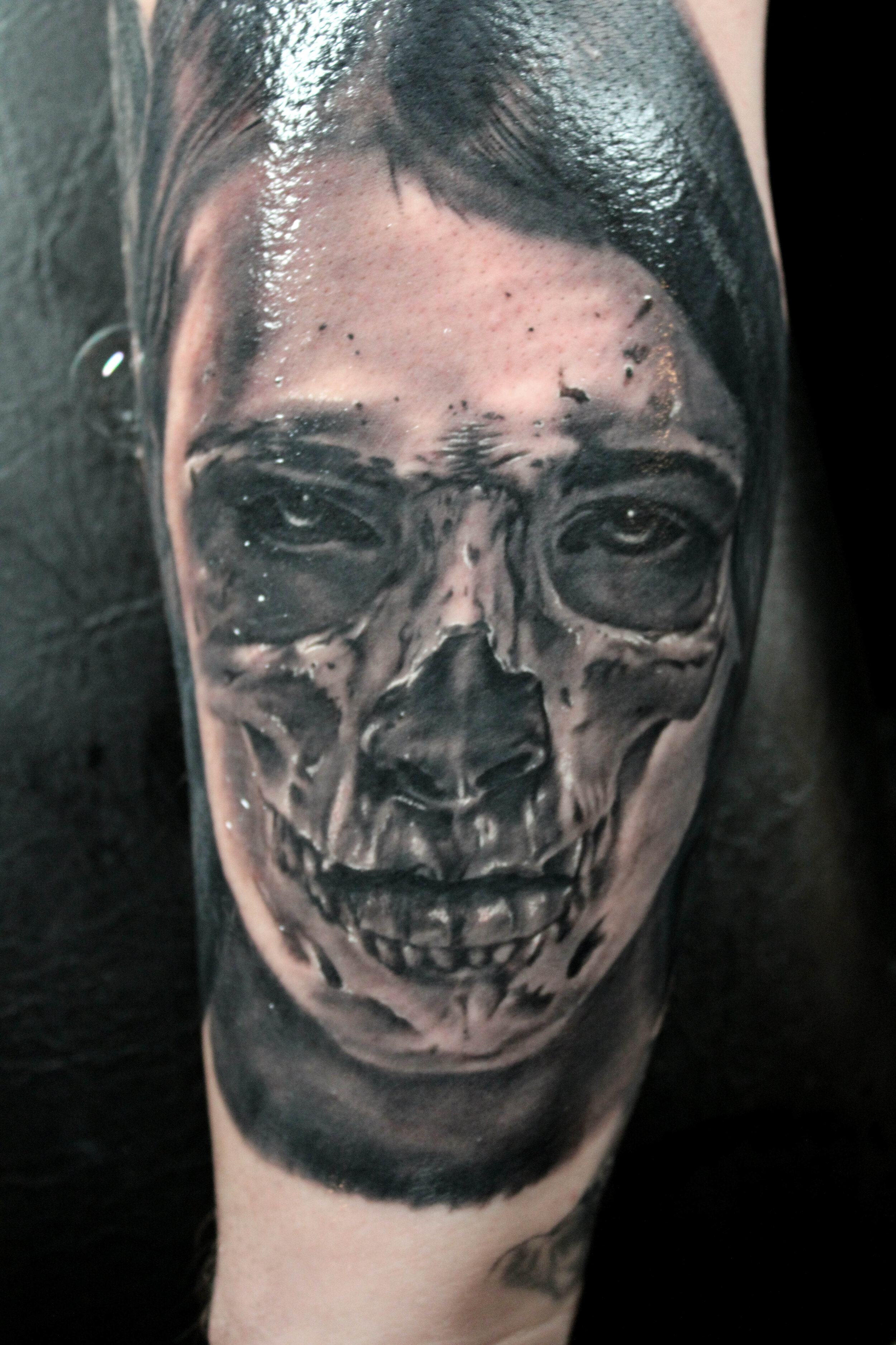 Having added the most recent ‘hear no’ piece to his ‘see no evil, hear no evil, speak no evil’ composition, Jason gets to realize the satisfaction of having a vision of his completed. The tone set by the piece is indeed a dark one, but the level of detail and density of the work create an exciting starting point for his sleeve of the macabre. The darkness within ourselves and each other being something we must all consider and come to terms with before realizing how much good we can be capable of and how choosing that goodness isn’t always easy.