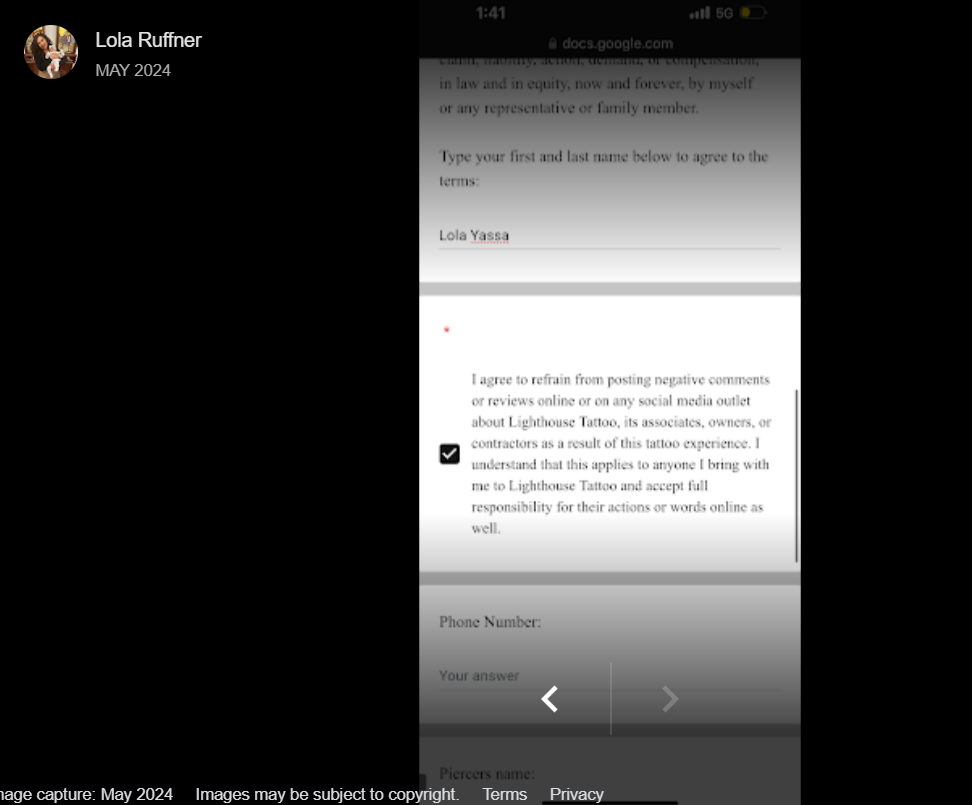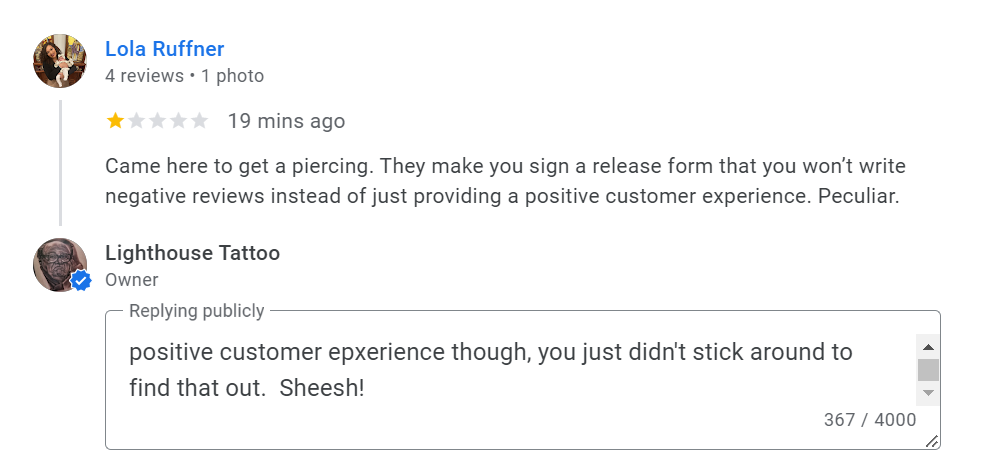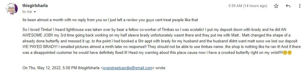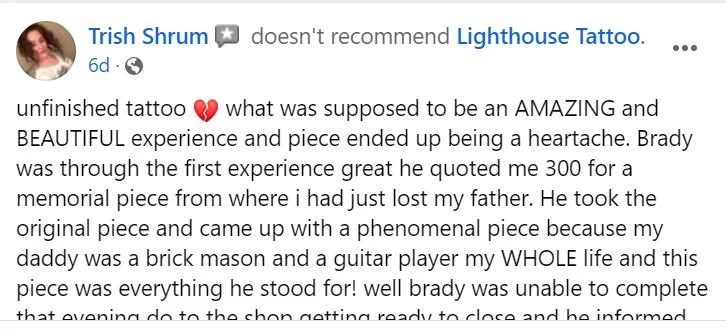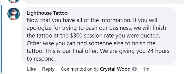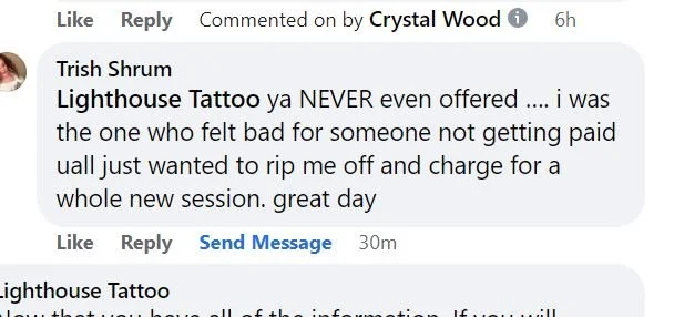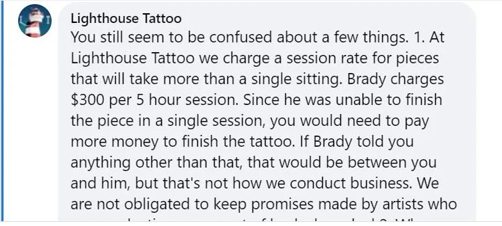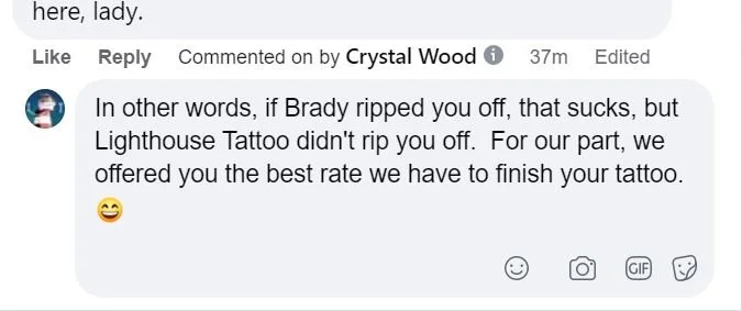 To summarize: She got tattooed by Brady and thought that she had paid in full. Brady got locked up. We told her she would need to pay another artist at the shop to finish the tattoo. She threatened to sue us. We told her she couldn’t come back to Lighthouse Tattoo again (we don’t take threats lightly). She goes on Facebook and tells people how we’d done her wrong. We explained the whole situation to her via the comments section and once we knew she had our side of the story we offered ONCE MORE to finish her tattoo at our lowest session rate. We literally don’t have anyone at Lighthouse Tattoo that charges that little anymore, even Will’s apprentice Matt has stepped up his rate to $400 for 5 hours. So we essentially offered her a $100 discount off of our established session rate in order to get her price down to Brady’s level. AAAAANNNNNDDDDDDD we think she turned us down because about an hour and a half later she told us we ‘never even offered her anything’. Which is why we think she’s crazy.