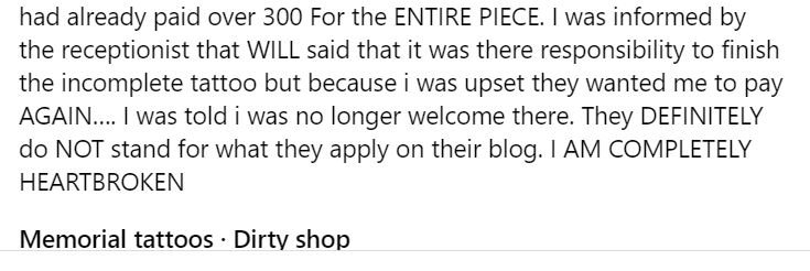 A bit of insight: That tattoo is not small. It’s from her knee to her hip and will probably take at least a couple of hours to finish. Most tattoo artists charge $100 per hour, with many charging in excess of that. Simply put, we don’t see her being able to get that tattoo finished for less than $300 unless a tattooer reads this and feels sorry for her or something. It would be in her best interest to just pay us to finish it and that way she would at least have a finished tattoo. If you want to bitch about how you were treated after the fact that would have been wise, but this is just plain dumb.
