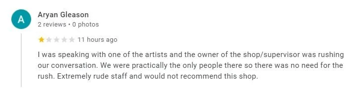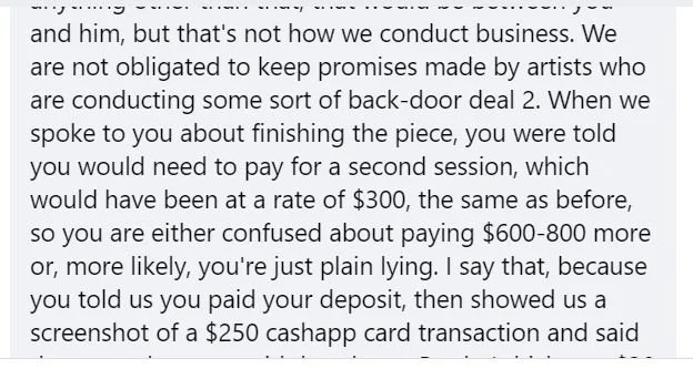 We also want to point out some inconsistencies in her story. The first time we spoke she said she’d paid Brady $300 with a $30 tip, then the second time we talked she said she’d given him a $200 tip, both times arguing that she had paid in full for a tattoo that she had not paid in full for. Then, she said we were going to charge her an additional $600-$800, a number she pulled entirely out of her ass, no one ever said that to her, I was there! If the tattoo didn’t take at least 3 hours to finish, then she wouldn’t even have to pay the full session rate (we base our sessions at $100 per hour for the first three hours, with the last two hours being free). She threatened to sue us, which only a really stupid or really crazy person would do (why in the hell would you want to threaten someone you want to get tattooed by, what a moron!) and finally, after extending an olive branch by offering to tattoo her at the original session rate price, she stated online that we didn’t just offer to do what we had just offered to do. and now I have a headache.