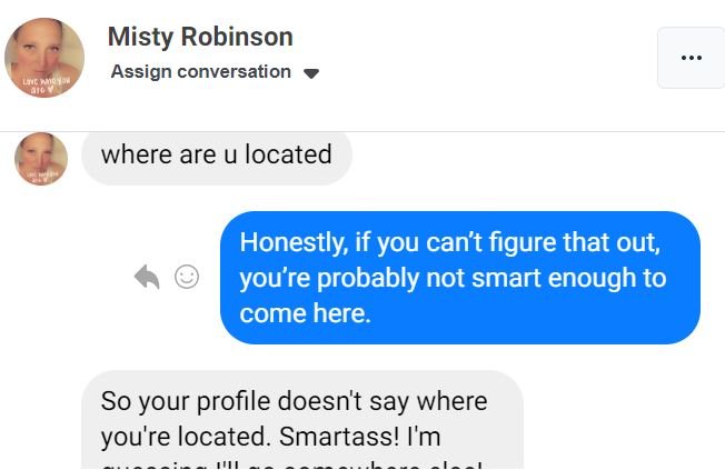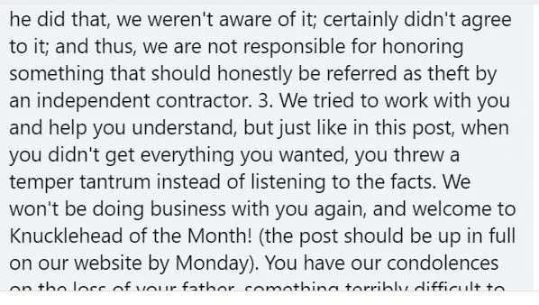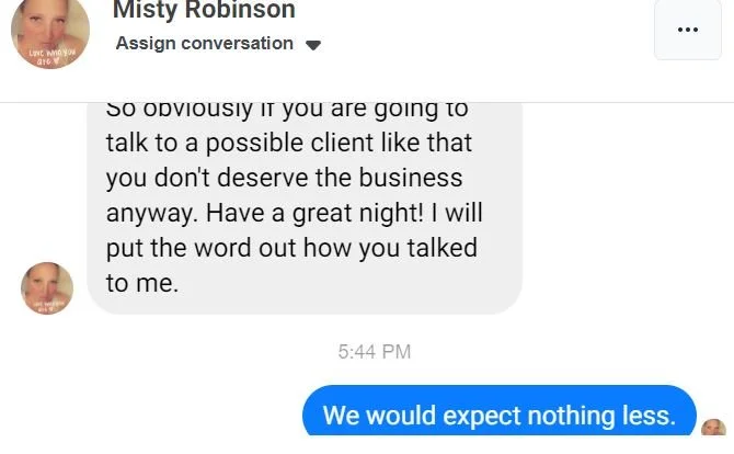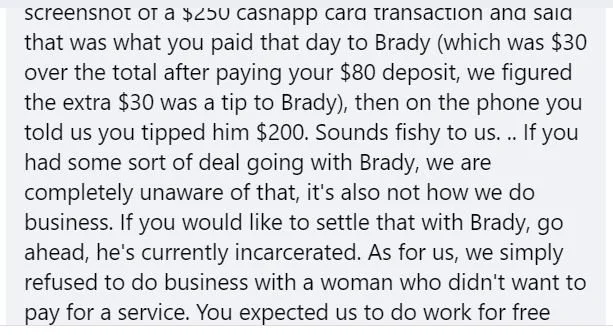 In short, some people find it impossible to change their mental state. Once this woman got angry, she doubled down on angry at every opportunity. Instead of listening to reason or understanding that we were TRYING TO HELP HER, she decided that we were trying to rip her off. She’s made threats and has continued to try to hurt us in any way she can. Good luck lady, you’re probably gonna need it.