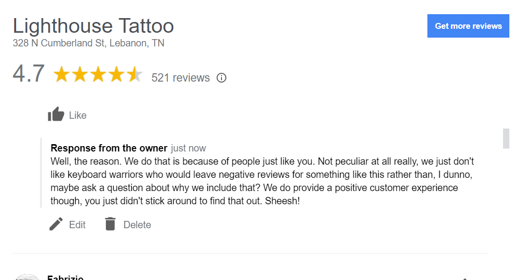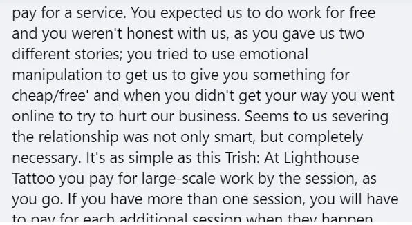 Any of several things might have happened here: 1. Lots of people only hear what they want to. Doesn’t matter how many times you tell ‘em. We tell someone they will be paying $300 or $400 for a session depending on which artist they work with and THEY HEAR the tattoo will only be $300 or $400, when that is simply not the case. It’s not something we hide in the fine print mind you, people try to make it sound like that but they’re being dishonest as hell when they do. The shit’s on here and on their deposit slip (which everyone had to sign before getting tattooed, to make SURE they know) and they still try to shoehorn us into giving them something for nothing, as if their complaining will get them anything other than kicked out and banned for life. May work in some other places, but to don’t work at Lighthouse Tattoo. We have a reputation to maintain, after all. Maybe this woman only heard the tattoo would be $300 when Brady actually told her it would be $300 PER SESSION, and she just wouldn’t listen, once again, happens all the time. But we’ll come back to this idea. 2. Maybe she worked out some sort of ‘deal’ with Brady. Now, this deal wasn’t approved by our owner Will, and thus, wouldn’t be legitimate. It would at least fall into the category of shady and would get Brady counselled and possibly fired, for stealing. Sometimes tattoo artists will work out a bigger ‘tip’ ahead of time in exchange for charging the client less. This ends up with the artist making proportionately more of the money and the shop proportionately less than what was agreed upon earlier and the client saves a little money too. It’s essentially a way of ‘skimming off the til’, and it’s used by unsavory types to steal from their bosses. Not saying this is what happened, it’s just a possibility, and with Brady being relatively new, it may have been a practice of his, borne out of some sort of defense mechanism or survival strategy when he was working at a shop where he didn’t make as much money as he did at Lighthouse Tattoo. It’s not like we haven’t seen it before. We don’t hate him for it, but it’s not the way we do things. 3. The woman’s out of her mind. There’s a case to be made for this based on the interaction we’ve had with her. Now, we don’t mean she’s full-blown Wacko’loon and shouldn’t be allowed to drive or something, just that she seems to get her wires crossed. Either way, she’s DEFINITELY emotional in a way that makes it hard to deal with (which makes some sense, this is a memorial tattoo for her deceased father after all) and she seems determined to double-down on some very poor choices she’s made. We will come back to this point as well. and point #4. She’s lying. Could be she’s just plain lying to get something for free and she thinks that we will give her what she wants if she throws a big enough fit. Not gonna happen folks, reputations and all.