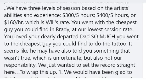 Point #2 Why on Earth would you try to get a deal on a tattoo? and even IF that were a good idea, why would you do it when the tattoo in question is a giant MEMORIAL PIECE FOR YOUR DEAD FATHER?!?! and point #3 Even if Brady fed her some line of shit, why wouldn’t she just listen to us and take the best deal she’s going to get once she finds out he’s gone? I mean, it’s not hard to find out how we do things, it’s literally written all over this website, on paperwork at the shop and anyone who has worked here for more than a couple days can tell you the session rate and will if you ask them!